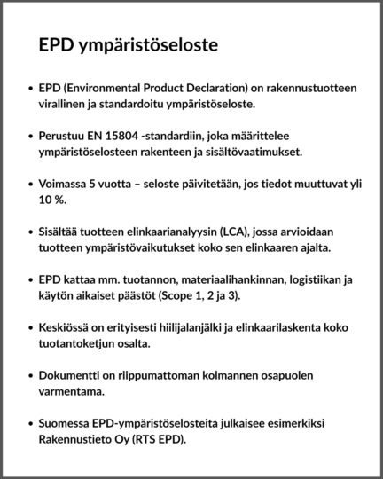 EPD on riippumattomasti varmennettu, standardoitu dokumentti, joka kuvaa tuotteen elinkaaren aikaiset ympäristövaikutukset, kuten hiilijalanjäljen, energiankulutuksen ja kierrätettävyyden.
